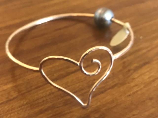 ハートのデザインが施されたタヒチアンパール 付きのバングル です。 サイズは、7-3/4インチですので、19.68cmとなります。
