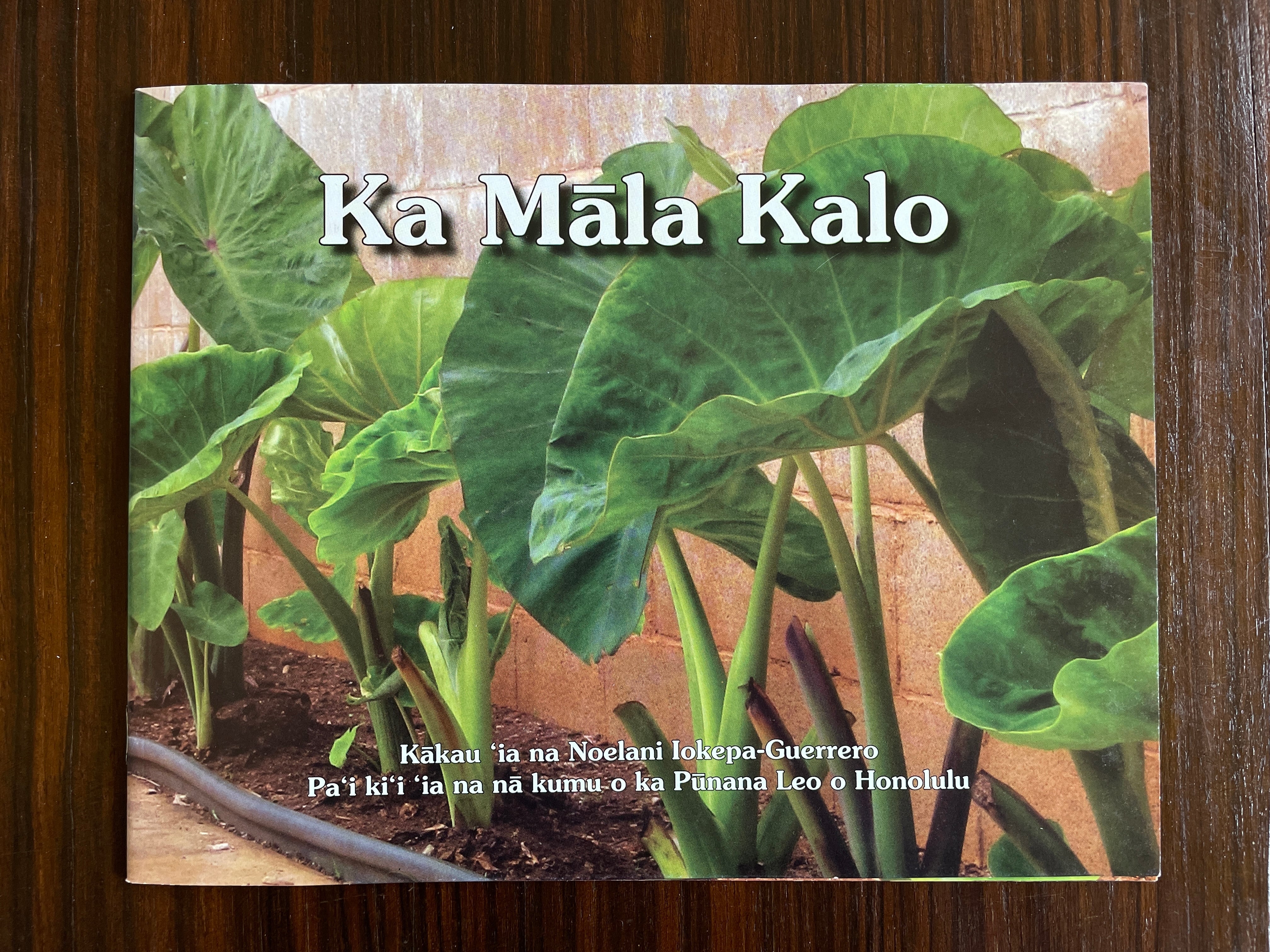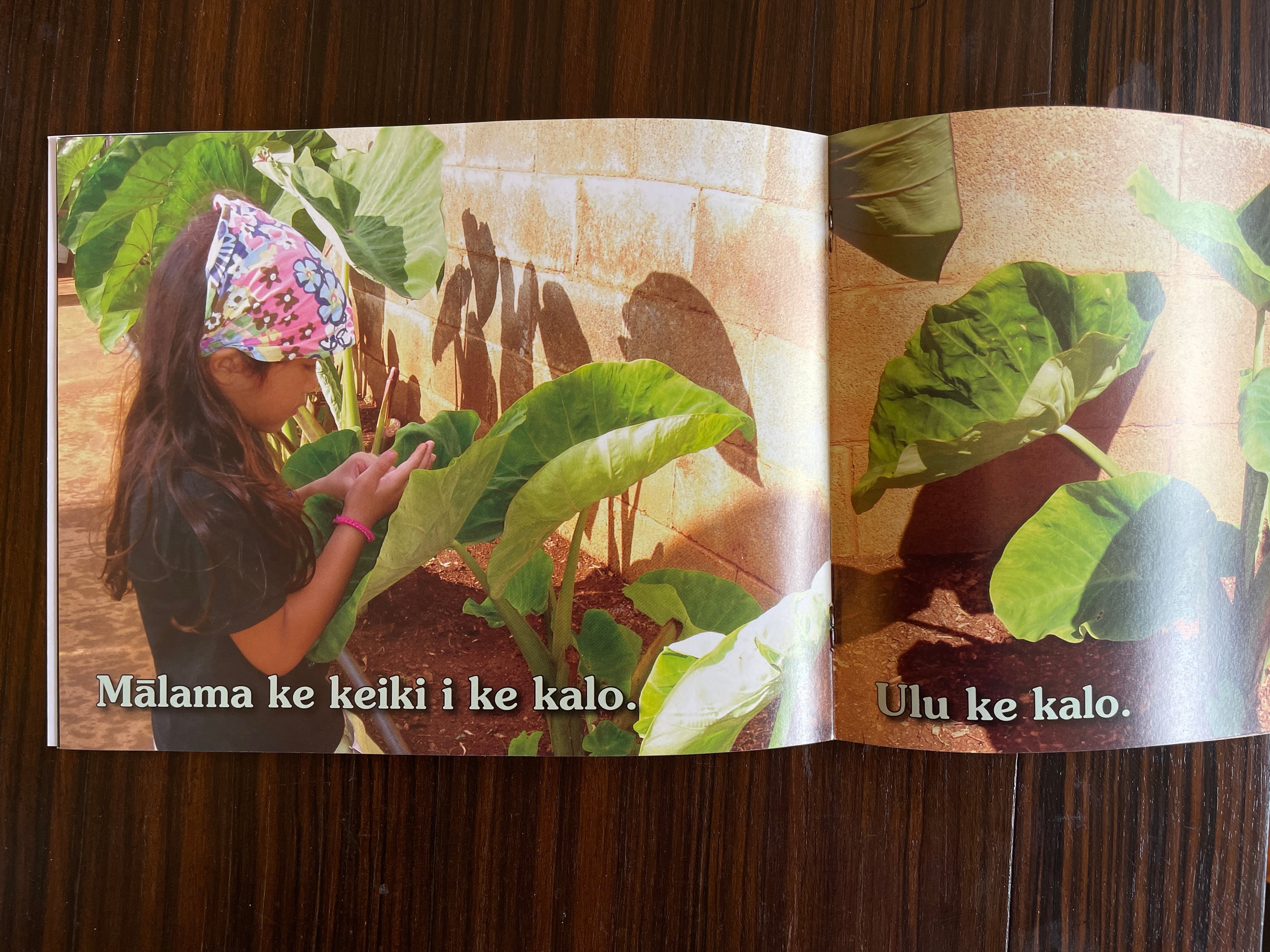 内容 : 家の庭に穴を掘って、タロ芋のフリ(苗)を植えて、水をやってお手入れして、周りに子株が芽吹きと、庭のタロイモ畑が成長してく様子を写真とハワイ語で説明しています。
